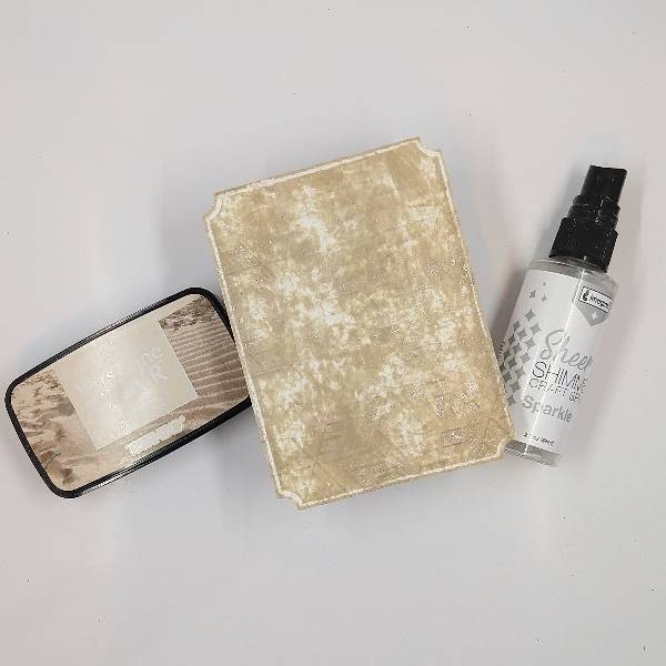 Spray Sparkle Sheer Shimmer Craft Spray onto an embossing folder and then emboss the Sand Dune colored panel by running it through a die cutting machine between the two sides of the embossing folder. Allow the panel to dry.