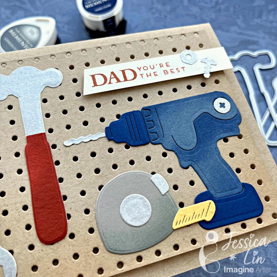 Hi everyone! It’s Jessica here. Today I would like to share a Father’s Day card that showcases different tools to thank my dad for all the home improvement projects he has done in the past year. I also ink blended Memento inks on the die cut pieces to create more depth. If you’d like to learn some tips and tricks on ink blending small paper elements, just keep reading!