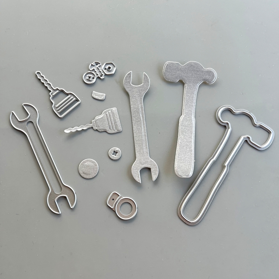 First, I die cut several tools from a silver cardstock. I’ve had this paper for a long time since my scrapbooking days, and I am glad to finally use it again. I also adhered Stick It sheets to the back of the silver cardstock before die cutting, so that all of the elements are adhesive backed. This will make adhering to the small tool pieces easier and mess-free.
