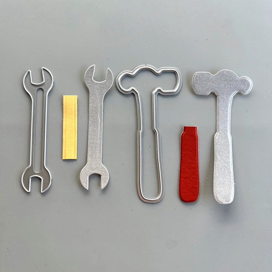 Die cut again with colored cardstock to create the handles on the tools. I used So Saffron cardstock for the wrench and Cajun Craze cardstock for the hammer.