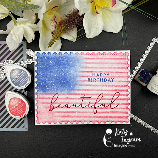 Hello Friends! Katy here with another quick project for you. Today’s card is for Independence Day here in America, coming up on July 4th and I thought I would use my supplies to create an American Flag. I used a diagonal stencil to create my stripes and some sponge swiping to create my blue section and some splatter for my stars. Some simple techniques with minimal supplies to add to your card making arsenal.