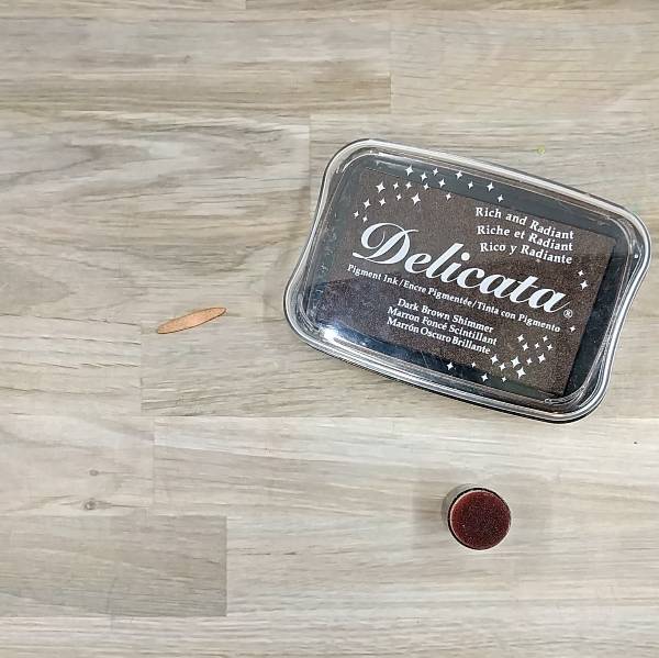 Ink blend the edges of all three coffee dies with Dark Brown Shimmer Delicata ink with an ink dauber. Then glue the three small brown die cuts into the three coffee cups on the cardbase.