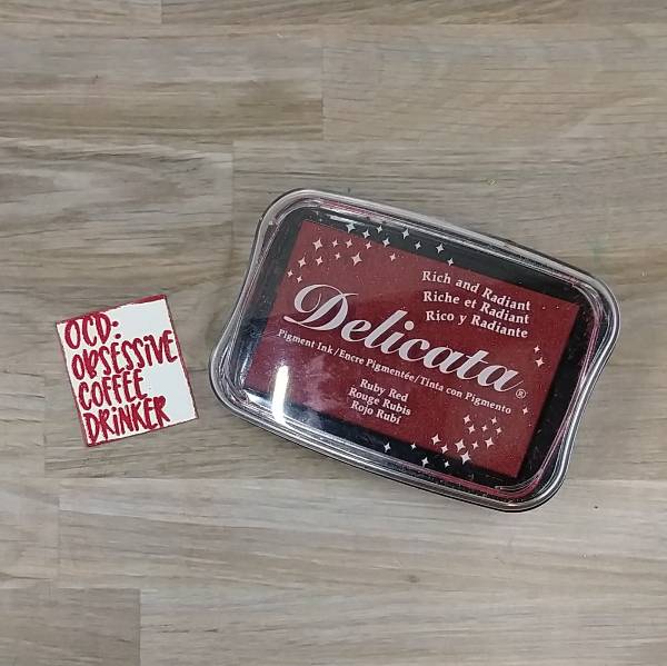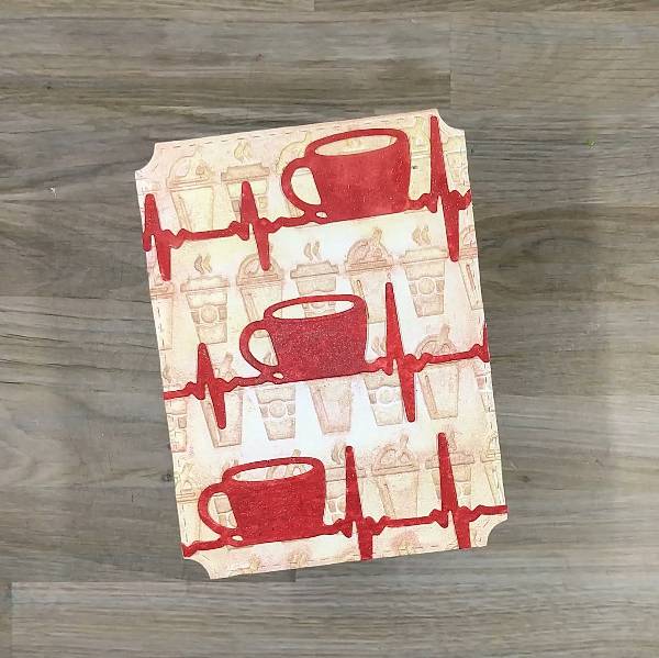 Before gluing the die cuts, I pressed the center coffee cup into the Ruby Red Delicata ink pad to change the color of that cup just a little. Glue all three die cuts down and trim the edges with scissors.