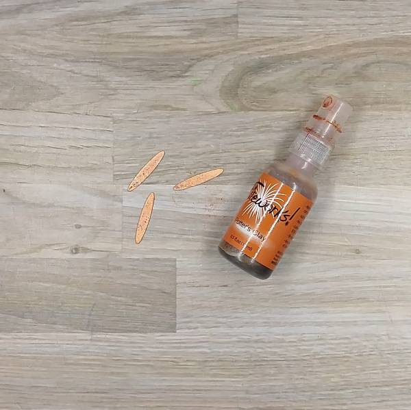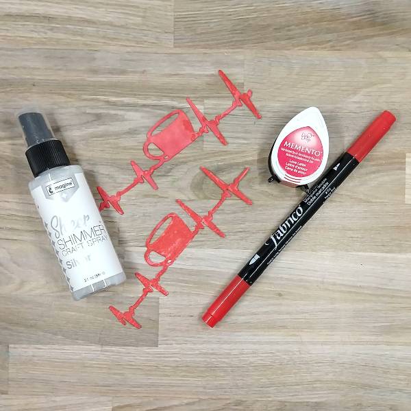 After die cutting the colored watercolor paper, use a Poppy Red Fabrico marker to fix any areas that weren’t colored with the ink pad.Then spray the die cuts with Silver Sheer Shimmer Craft Spray.