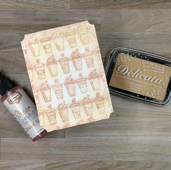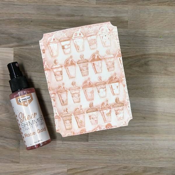 Die cut a piece of watercolor paper with the second-largest die from an A2-sized background die set. Then spray Rose Gold Sheer Shimmer Craft Spray into a coffee-themed embossing folder and emboss the watercolor panel. Allow the spray to dry.