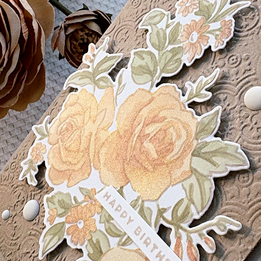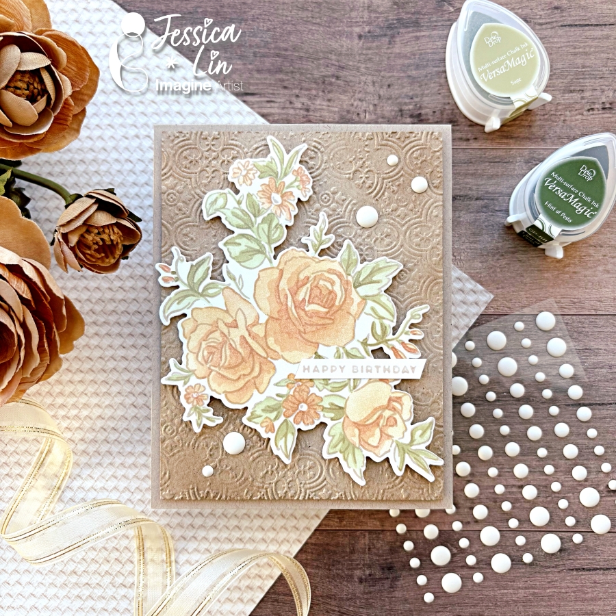 Hi everyone! It’s Jessica here. Fall is right around the corner and I have a fall floral card to share with you today. I decided to do some layered ink blending using shimmery Delicata ink pads. They are pigment-based and mostly used for stamping. However, they ink blend beautifully, too! Be sure to check out the shimmery effects of these ink pads at the end of this post.