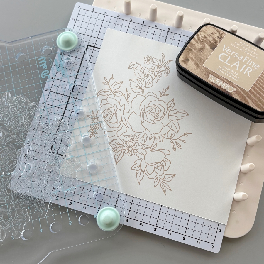 Stamp the large floral image from Stampin’ Up’s Layers of Beauty set with VersaFine Clair Sand Dune ink pad. This color is becoming my favorite for stamping outlines. The soft, neutral tone creates an entirely different feel compared to black image outlines.