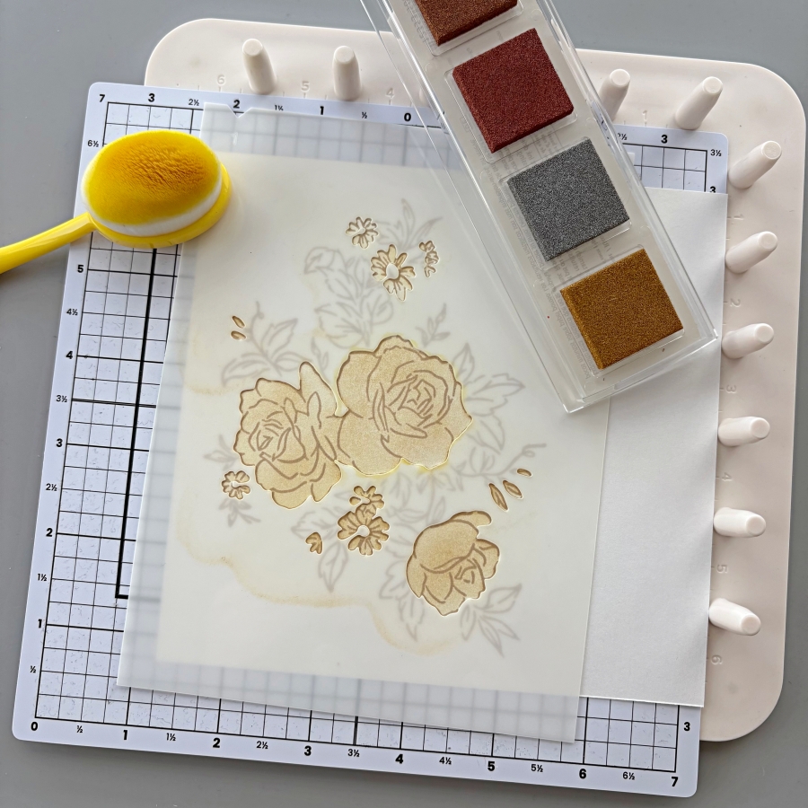 For stencil 2 and 3, I ink blended Bronze Burst and Celestial Copper. These two shades are similar, with Celestial Copper having a redder hue. I thought they contrasted too strongly against the golden base layer, so I ink blended Bronze Burst lightly to the base layer as well.