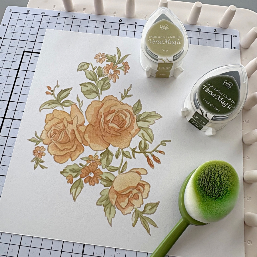 For the leaves, I ink blended VersaMagic Sage for stencil 4 and Hint of Pesto for stencil 5. Once the ink blending is completed, I die cut the floral image and mounted the back with foam tape.