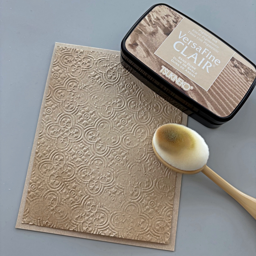 I prepared a card base using Neenah Desert Storm cardstock. Then I embossed a 4’’ x 5 ¼’’ panel with Stampin’ Up’s Distressed Tile embossing folder. To create some background depth, I ink blended the corners of the embossed panel with VersaFine Clair Sand Dune ink pad.