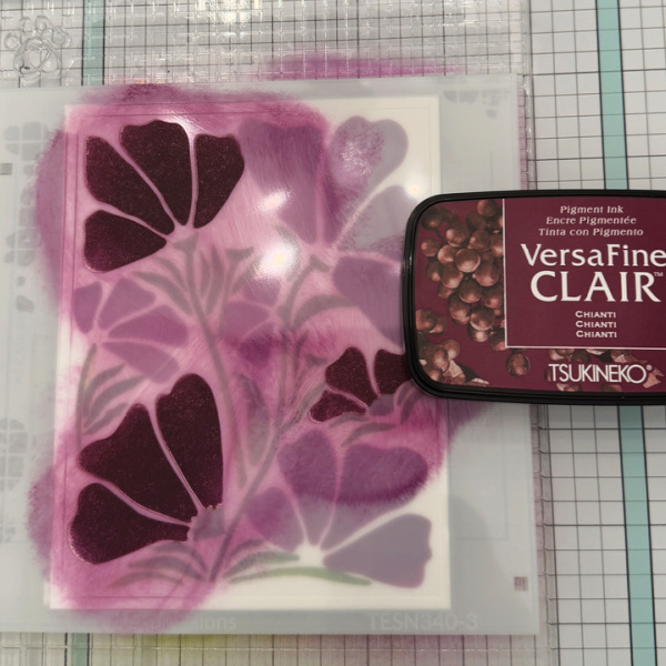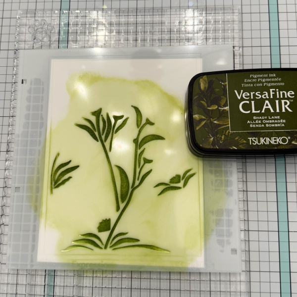The stencil set I used has four different layers. The first stencil in step one is to use Shady Lane to color the stems.