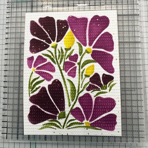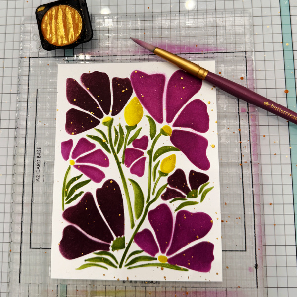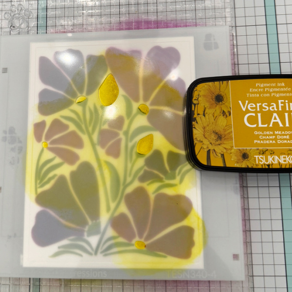 Using the fourth layer of the stencil and Golden Meadow, color in the flower centers and buds.