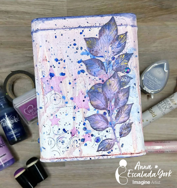 Splatter the tin with more Paris Dusk Fireworks! Craft Spray. Allow it to dry. Then glue dark blue gems around the leaf clusters to finish the box on the two slides with leaves.