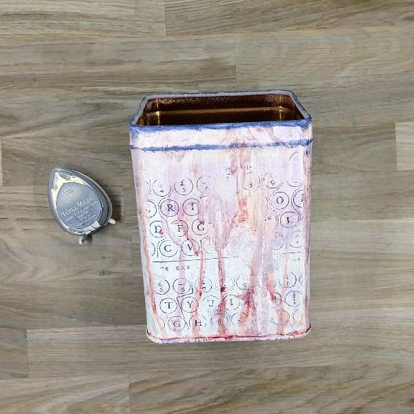 Partially stamp each of the four sides of the tin with Night Sky VersaMagic ink on a background stamp. (I used an old woodblock typewriter stamp.) Then press the ink pad along the top edge of the tin and the raised rib as well. Heat emboss the top rim of ink with clear embossing powder.