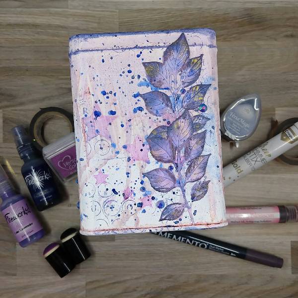 While the tin was drying, die cut four leaf clusters out of watercolor paper. Then randomly add Paris Dusk Fireworks! Craft Spray to the centers of each leaf with the stick of the spray nozzle and color the outsides of the leaves with Elderberry Memento Dual Marker.