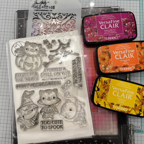 Gather your supplies. You will need a Halloween themed stamp set, a stencil, white and black embossing powder, some markers if you have a line art image and three Halloween colors of ink.