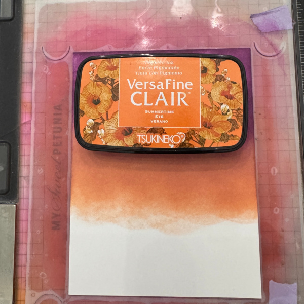 Ink Blend an orange (VersaFine Clair Summertime used) ink over the second third of the panel.