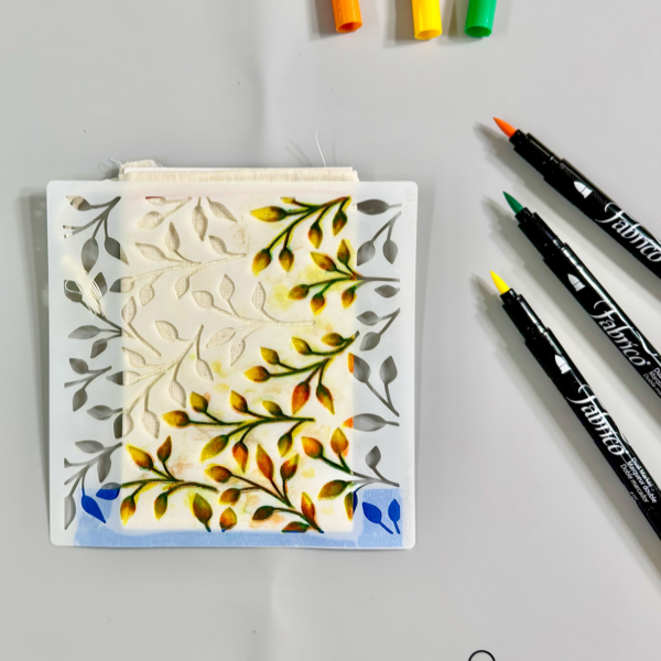 Use Fabrico Markers to color through the leafy stencil. To do the ink blending, start with dark color first, then medium color, then lighter color after to blend the color together.