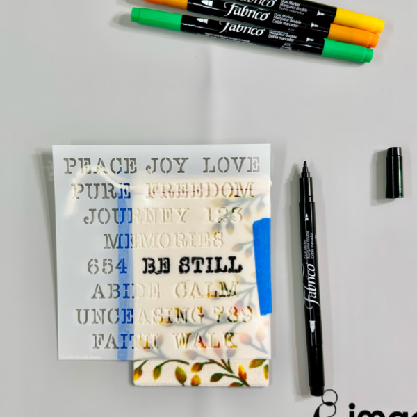 On this one, I decided to add the word Be Still on the bag using stencil and Fabrico Marker.