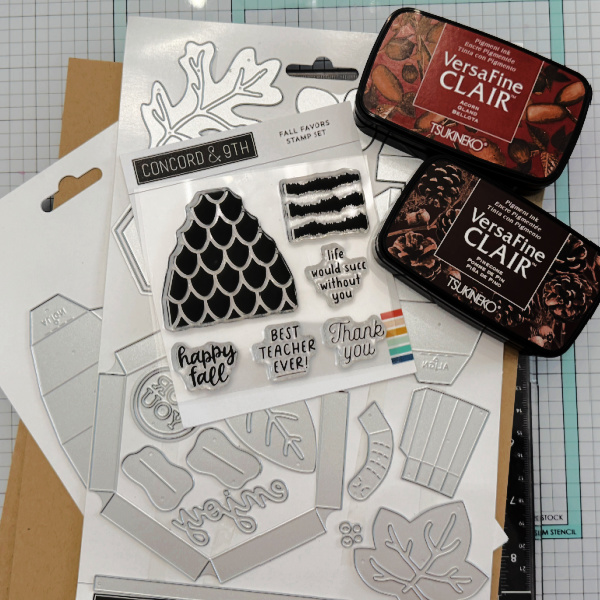 Gather your supplies. For this project you will need the Fall Favors Box die set and the coordinating stamp set. A dark brown ink (VersaFine Clair used here), Kraft and other colors of cardstock.