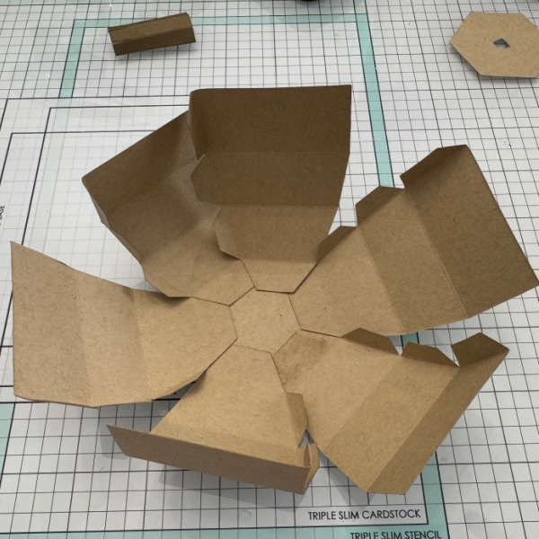 Out of kraft cardstock, cut six pieces each of the small (top) and large (bottom) of the acorn, along with the top and bottom hexagon pieces. Cut the stem out of a dark brown cardstock and the leaves out of your color of choice.