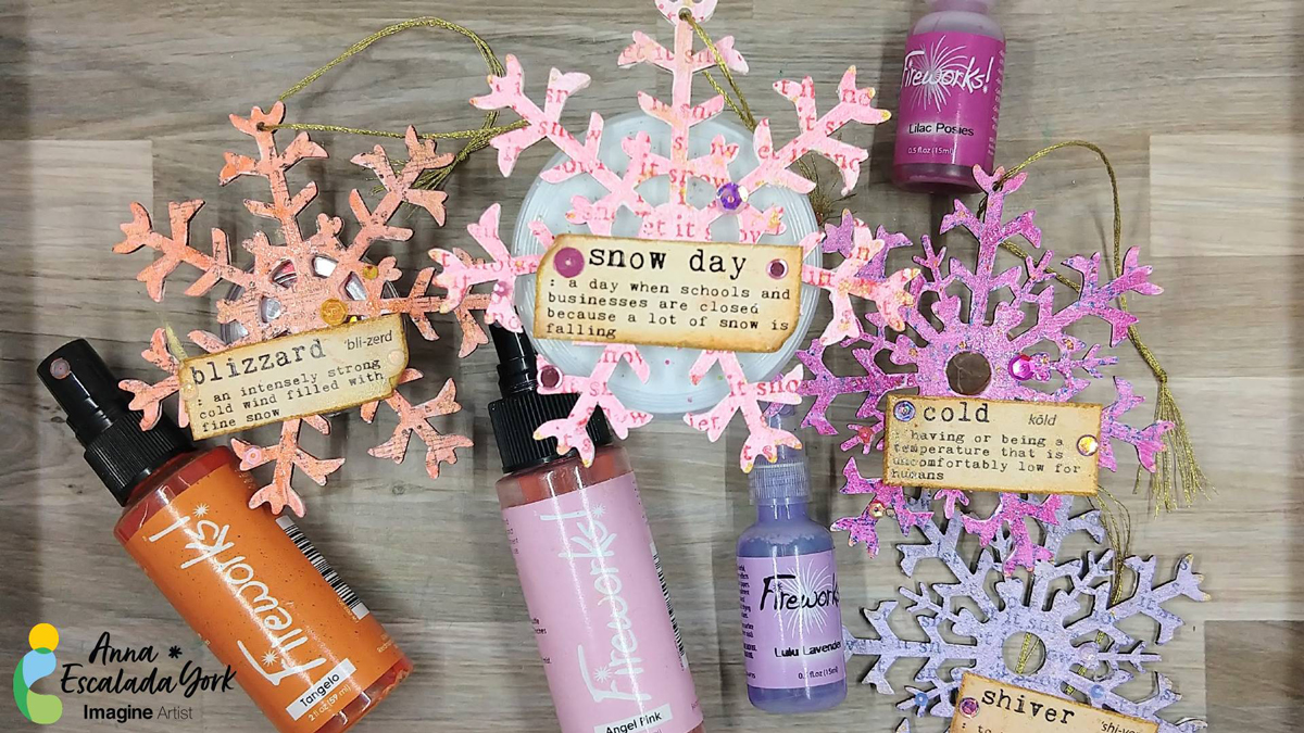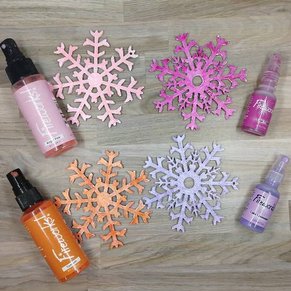 When I saw these fun chipboard snowflake ornaments in my local craft store, I knew I wanted use some Fireworks! spray to make them shine.