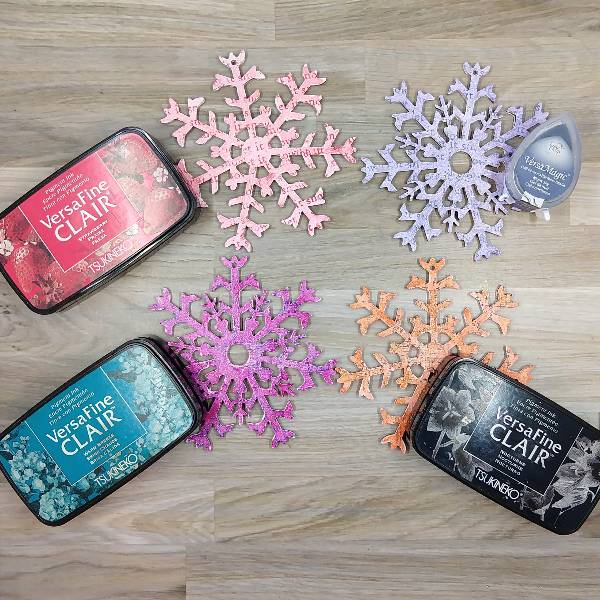 Use one of two small stamps to add some texture and color to each of the ornaments: Warm Breeze VersaFine Clair ink (on the Lilac Posies Fireworks! Craft Spray), Nocturne VersaFine Clair ink (on the Tangelo Fireworks! Craft Spray), Strawberry VersaFine Clair ink (on the Angel Pink Fireworks! Craft Spray), and Night Sky VersaMagic Chalk ink (on Lulu Lavender Fireworks! Craft Spray). Heat emboss each of the snowflakes with clear embossing powder.