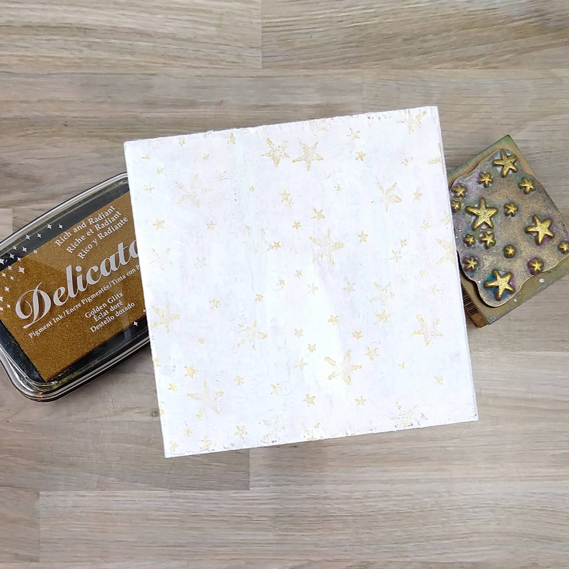 Cover the wood block with a layer of Gesso. Allow to dry. Then stamp the block repeatedly with Golden Glitz Delicata Ink on a small woodblock star stamp.