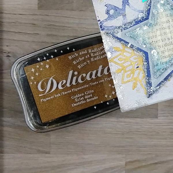Press Golden Glitz Delicata Ink onto another piece of watercolor paper. Then heat emboss with clear embossing powder. Die cut the paper with a small snowflake die. (The whole snowflake was tucked behind the star in the next step.