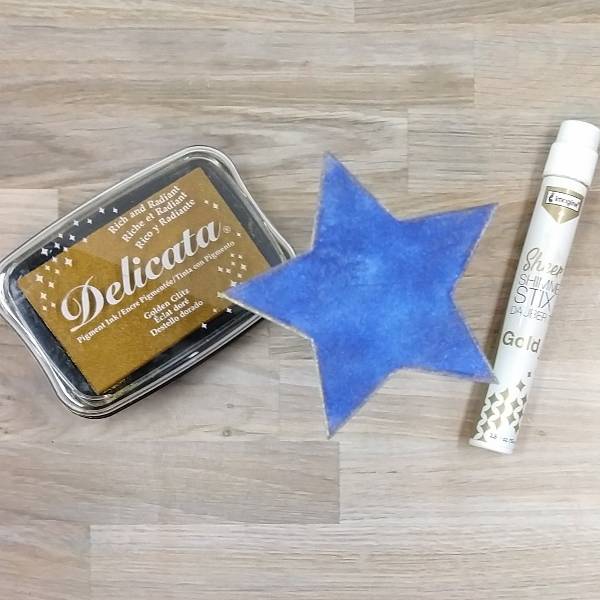 Press the dauber of a Gold Sheer Shimmer Stix Dauber Top stick along the edges of the blue die cut star. After drying, press the edge of the Golden Glitz Delicata Ink pad along the edges to enhance the gold border of the star.