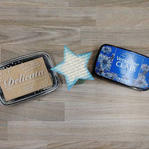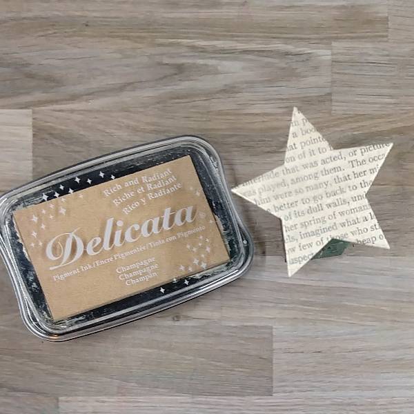 Glue a book page onto a scrap of cardstock. After the glue has dried, die cut the glued page with a smaller star. Then press a Champagne Delicata ink pad directly onto the die cut book page to obscure some of the words on the page and add sparkle.