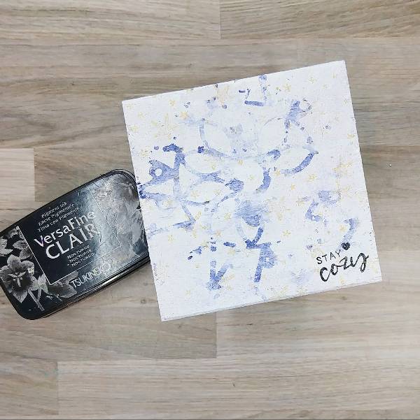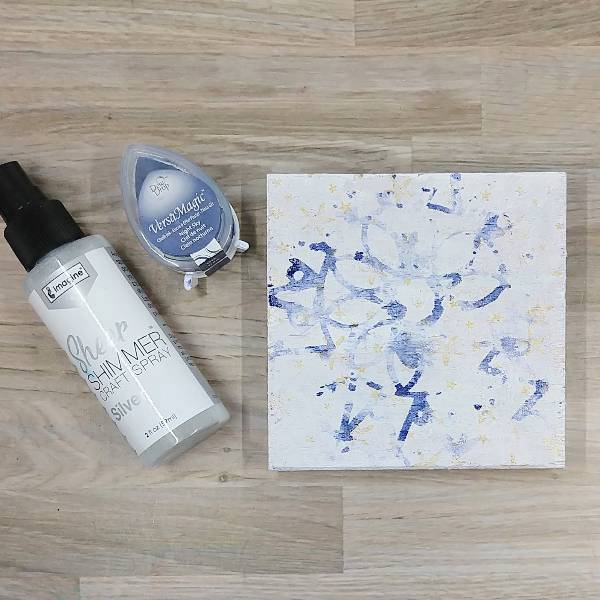 Press a stencil into a Night Sky VersaMagic Chalk Ink pad. Then spray the stencil with Silver Sheer Shimmer Craft Spray. Press the inky side of the stencil onto the wood block. Keep the stencil in place by placing something heavy (such as a large wood stamp or book) on top of both and allow the ink to dry. Then remove the stencil.