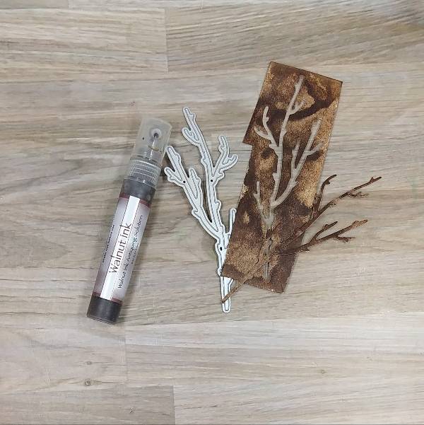 Spray Walnut Ink Antiquing Solution (in Walnut Ink color) onto a small piece of watercolor paper. After it dried, die cut with a branch die cut.