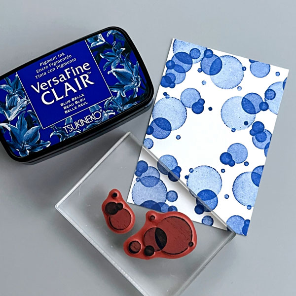 Stamp a bokeh background using Stampin’ Up’s Beauty Abounds stamp set. The stamp uses a unique technology to create light and dark shades even though I am only stamping with VersaFine Clair Blue Belle ink. I also tried to use splatter stamps to create a different background and that worked well, too.