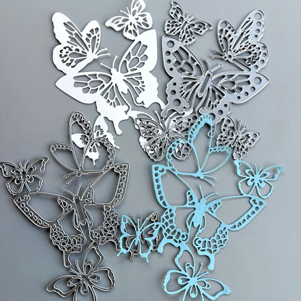 Die cut the bottom butterfly layer with white cardstock and the top layer with light blue cardstock. Then adhere the top layer to the bottom layer. Since this is an intricate design with fine lines, I adhered Stick It adhesive to the blue cardstock before die cutting. This way, the blue top layer becomes a peel and stick. Alternatively, you could use glue with fine-tip nozzles, like the On Point Glue.