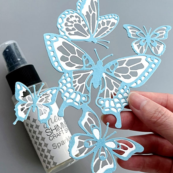 Then I spritzed a generous layer of Sheer Shimmer Craft Spray in Sparkle to create a subtle metallic shine on the butterfly die cut.
