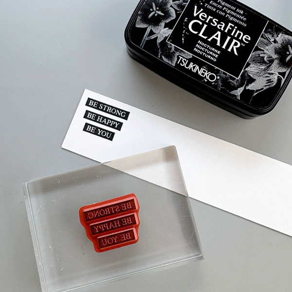 Stamp the sentiment with VersaFine Clair Nocturne ink pad. This stamp is from Stampin’ Up’s Rooted in Nature set. I decided to cut around each word to create the tape label look.