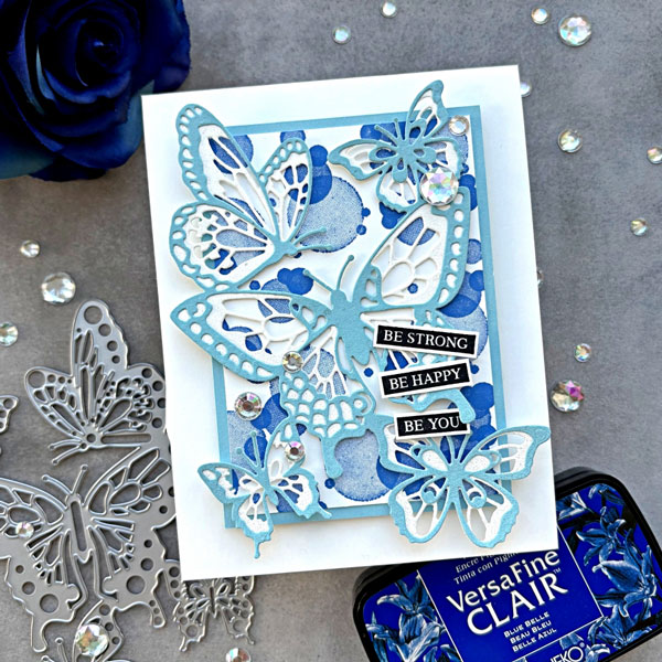 Apply On Point Glue to the butterfly die cut, avoiding the overhang areas, and adhere to the bokeh background. Then mount the bokeh background to the card base with foam tape. Finally, adhere the sentiment with Tear-It Tape and embellish with some rhinestones, and the card is complete!