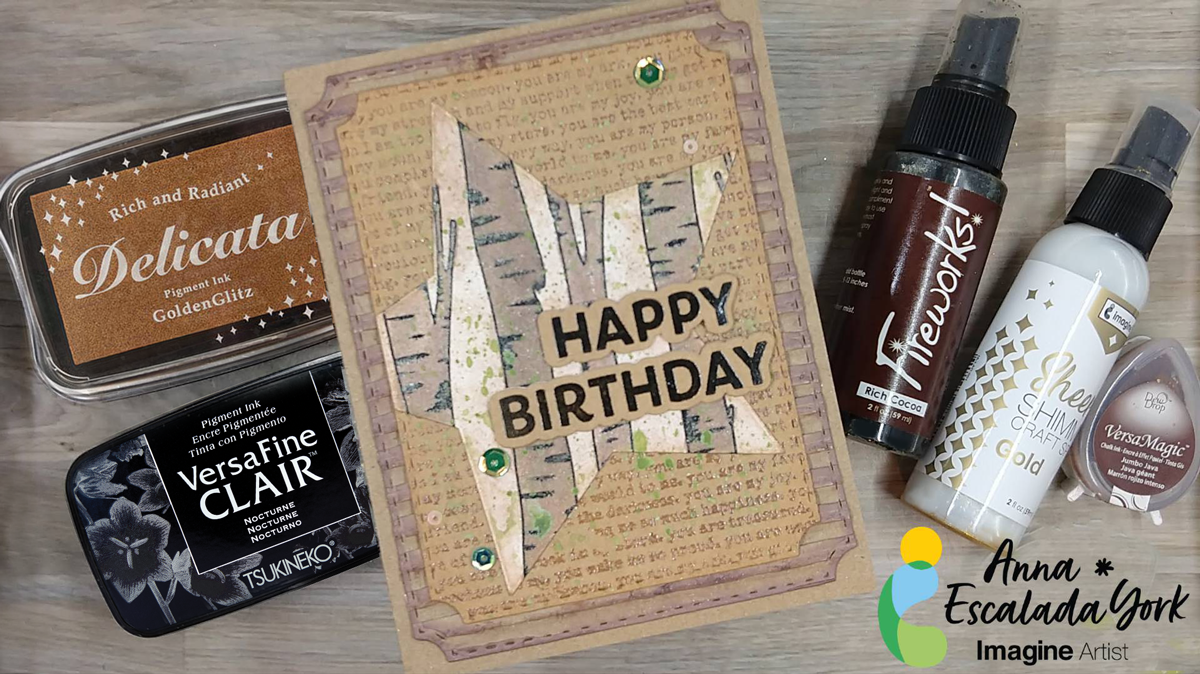 Lightly spray Rich Cocoa Fireworks! Craft Spray and Gold Sheer Shimmer Craft Spray onto the watercolor stamped star. Blot a little of the spray off with a paper towel and allow to dry. Then Then press Celestial Copper Delicata ink onto a piece of acetate packaging and spray with water. Watercolor smoosh the star by pressing the liquid copper onto the panel. Then repeat the watercolor smooshing with Jumbo Java VersaMagic Chalk Ink mixed with water on the acetate. Let the panel dry again.