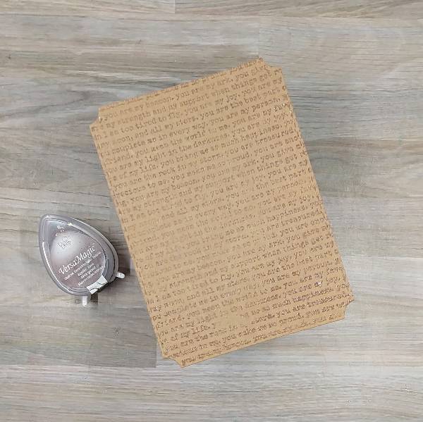 Stamp a piece of kraft cardstock with a text-based background stamp with Jumbo Java VersaMagic Chalk Ink. Heat emboss with clear embossing powder. Die cut the panel with the second-largest die from a nested A2-sized nested die set.