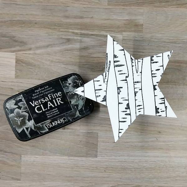 Stamp a large tree stamp set on a piece of watercolor paper with Nocturne VersaFine Clair ink. Heat emboss with clear embossing powder. Die cut with a mid-sized star die from a nested star die set.