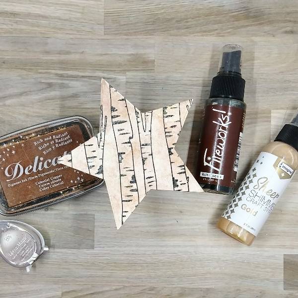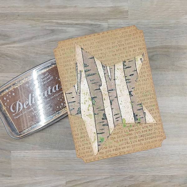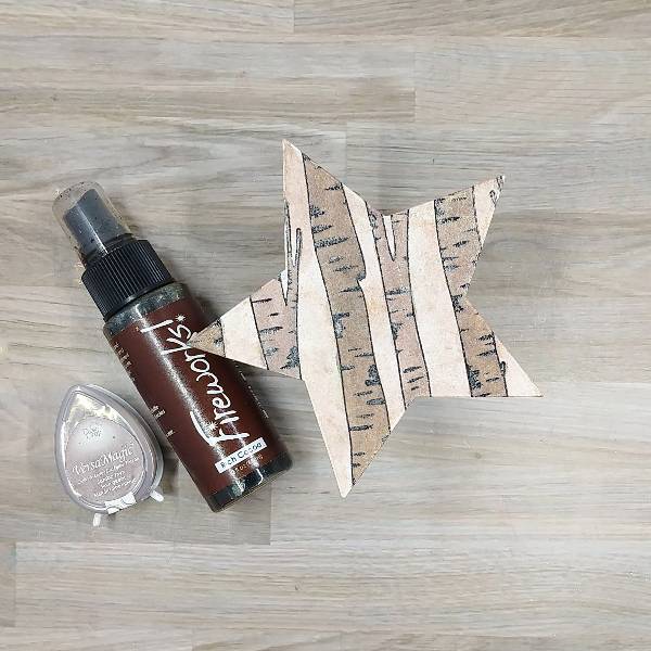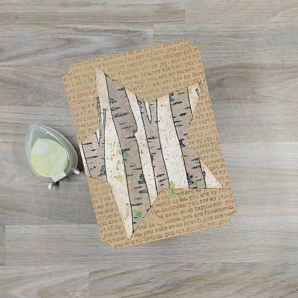 Use a sponge dauber to ink blend the edges of the star with Celestial Copper Delicata ink. Glue the die cut star onto the smaller, stamped panel. Trim the overhanging left part of the star. Then press Tea Leaves VersaMagic Chalk Ink onto acetate packaging and spray with water.