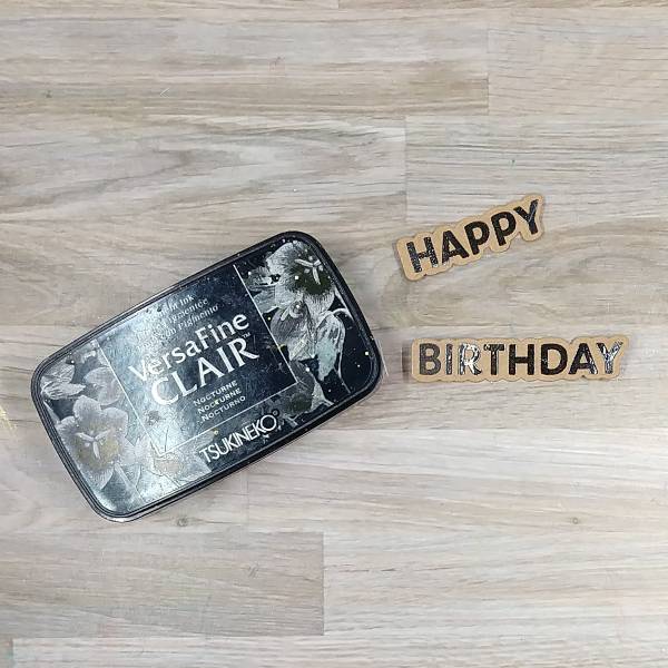 Stamp a sentiment on kraft cardstock with Nocturne VersaFine Clair ink. Then heat emboss with more clear embossing powder. Then die cut with the corresponding dies.
