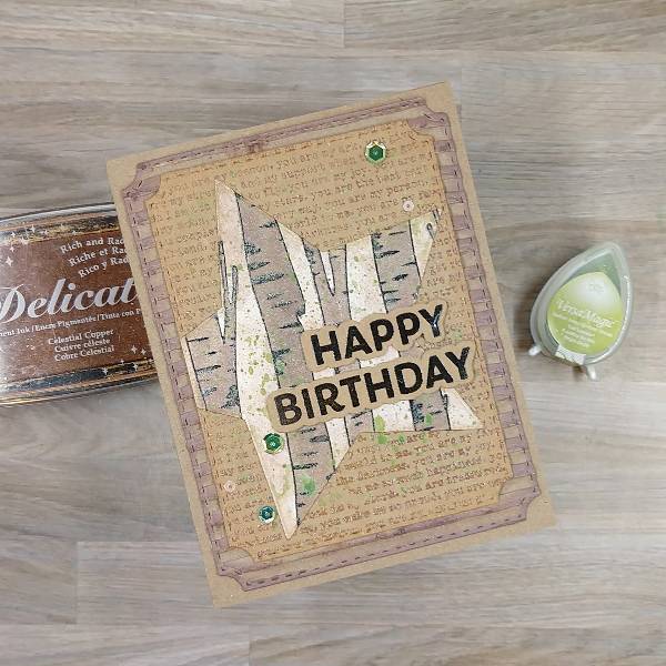 Brush the edges of the smaller, stamped panel with the Celestial Copper Delicata ink pad.