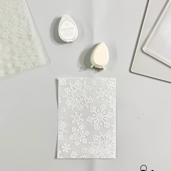 Add some of the Brilliance Moonlight ink to the embossing folder on the raised side, carefully add the vellum paper to the embossing folder, and then run it through the die cutting machine (make sure to follow your die machine sandwich instructions for embossing folder).