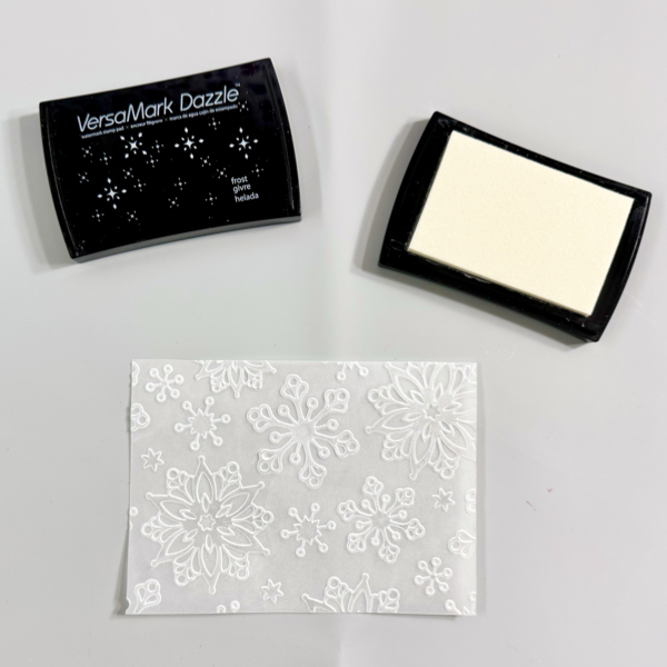 To add more shine and sparkle to the white snowflake embossed vellum, gently rub some of the VersaMark Dazzle Frost ink pad on the embossed side (raised image).