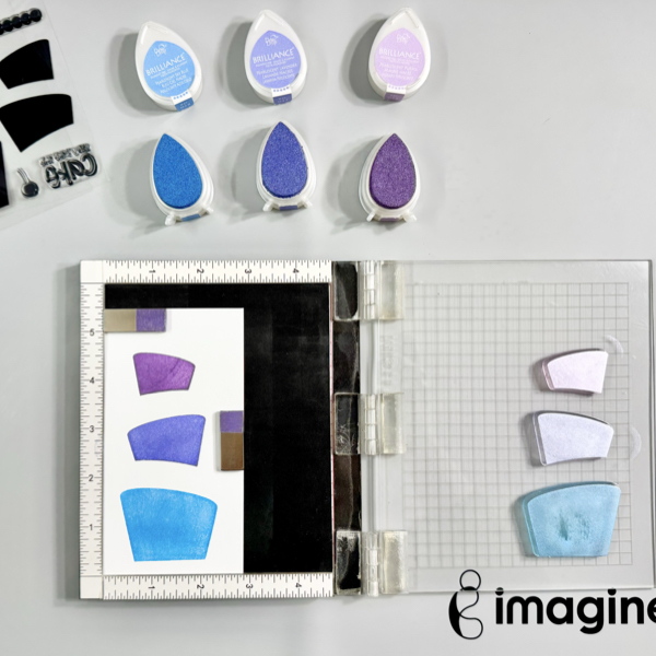 Add the 3 cake image stamps on the stamping tool, and then add the Brilliance inks (Pearlescent Purple, Pearlescent Lavender, and Pearlescent Sky Blue) to each cake stamp. Stamp them on a piece of white cardstock.