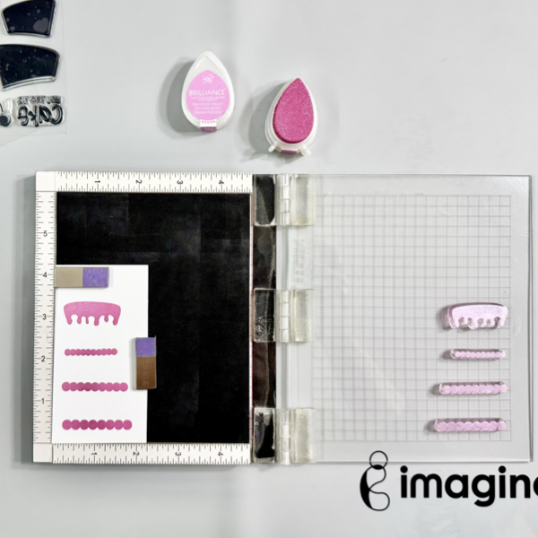 Add the icing image stamps on the stamping tool, and then add the Brilliance Pearlescent Orchid to each cake stamp. Stamp them on a piece of white cardstock.