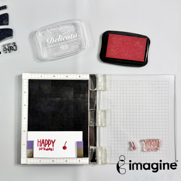 Next, stamp the cherry and sentiment using the stamping tool with Delicata Ruby Red ink on a piece of white cardstock.