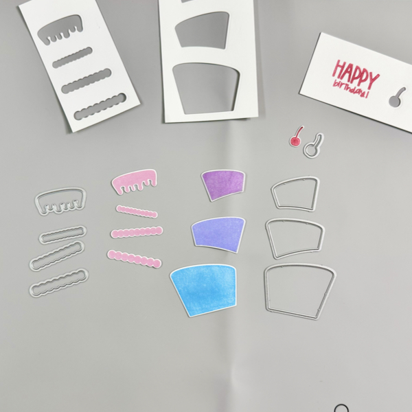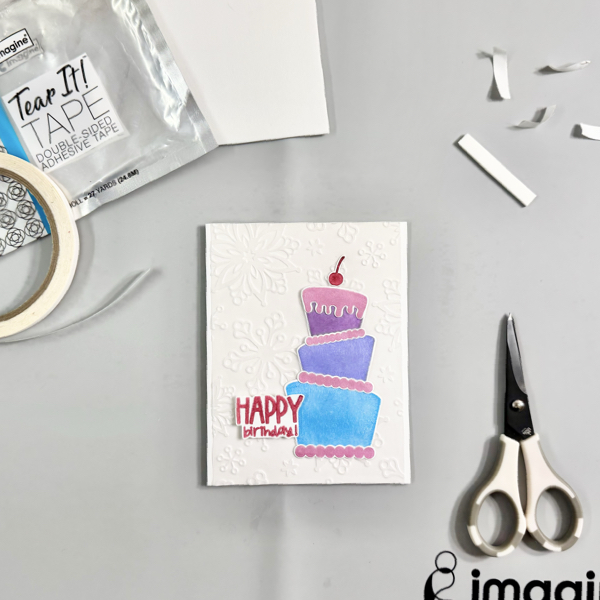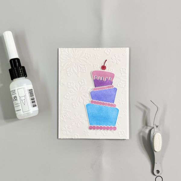 Add the birthday cake pieces to the card using On Point Glue, press gently to make sure they adhered well to the vellum background.